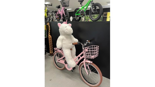 Cykelbamsen Cykeline begejstret over sin nye lyserøde cykel