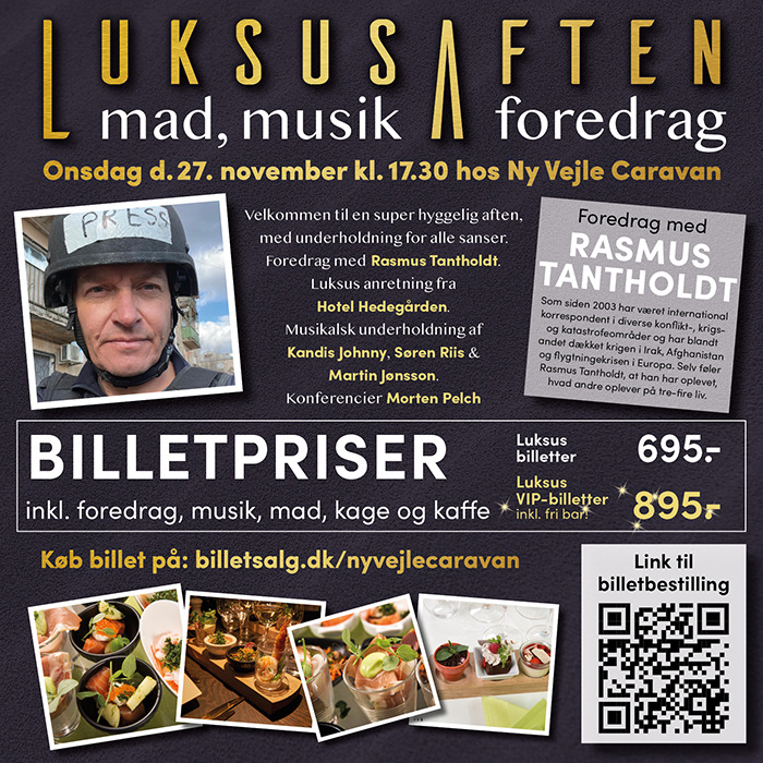 Onsdag den 27. november 2024 inviteres alle til en hyggelig aften på Ny Vejle Caravan A/S. Aftenen byder på et inspirerende foredrag af den kendte journalist Rasmus Tantholdt, der vil dele sine oplevelser og erfaringer fra sin karriere.