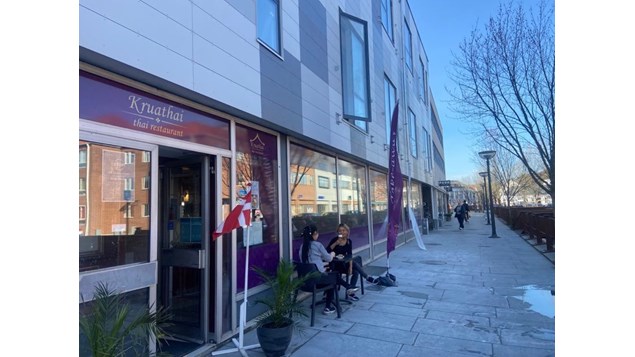 I stueetagen bor Kruathai. I restauranten er de rigtig glade for, at stilladset nu er væk, så de får vores udendørspladser tilbage, og så vores restaurant bliver mere indbydende for dem der går forbi.