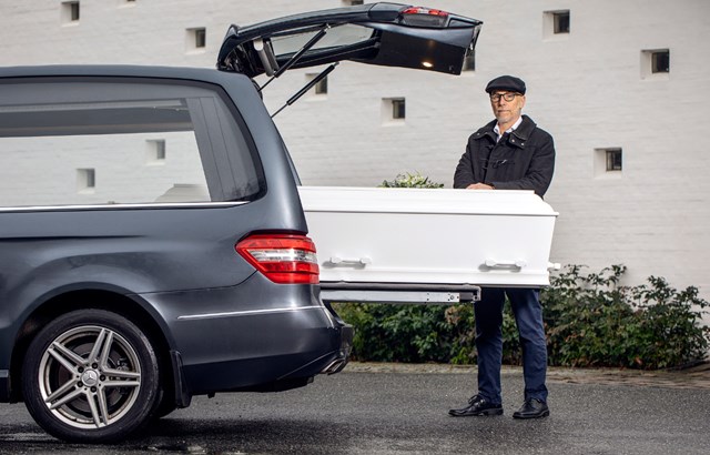 Kris Jennings med kiste ved rustvognen (Foto: Grejsdalens Begravelsesforretning)