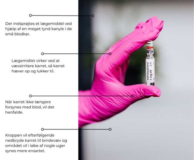Behandlingen foregår ved, at de injicerer en væske (Aethoxysklerol) direkte i de overfladiske kar. Væsken skaber en lokal irritation i karvæggen, som får karrene til at lukke sig og med tiden forsvinde. Resultatet ses typisk efter 1-3 måneder, når kroppen har nedbrudt de behandlede kar naturligt.