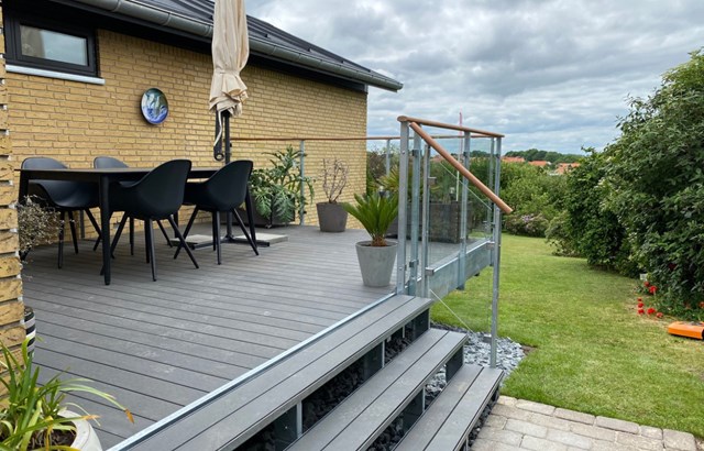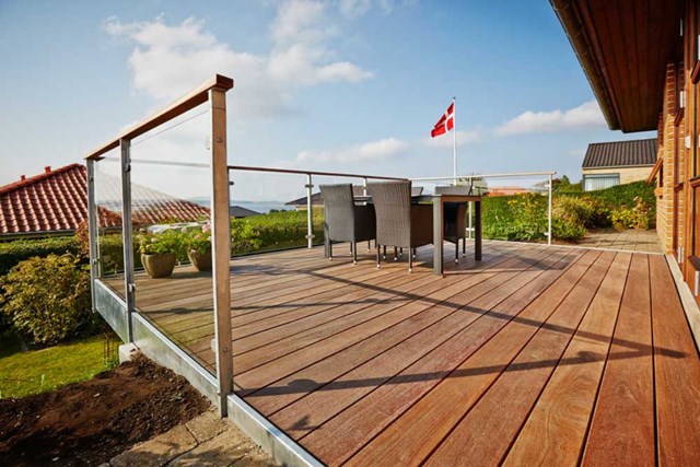 Glasgelænder og hårdtræ-terrassebrædder (Foto: Modulterrassen)