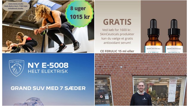 Top Clinic i Vejle tilbyder et specielt tilbud, hvor kunder kan vælge mellem to antioxidant-serummer fra SkinCeuticals ved køb for 1600 kr. Henrik Christensen Vejle præsenterer den nye Grand SUV E-5008, en 7-personers elbil, som har vundet Bil Magasinets test og fås fra 359.990 kr. Fri BikeShop Vejle fremhæver fordelene ved at cykle, både for miljøet og personlig sundhed, og opfordrer til at besøge butikken for at komme i gang. LeneS annoncerer en ny Cardio Jumping Bootcamp, der starter i uge 12, med en pris på 1015 kr. inklusive gratis holdtræning under hele forløbet. For flere detaljer, læs de oprindelige opslag.