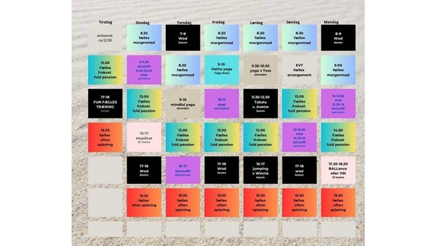 Vi laver selvfølgelig vores helt egen holdplan (den her er fra sidste år). Vi sørger for der er noget for alle, så det bliver en god blanding af koreografi træning, puls, styrke, yoga og meget mere Der vil også være deres egen holdplan som du også kan deltage i.
